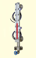 控制型是在翻柱液位計(jì)的基礎(chǔ)上增加了磁控開(kāi)關(guān),在監(jiān)測(cè)液位的同時(shí)磁控開(kāi)關(guān)信號(hào)可用于對(duì)液位進(jìn)行控制或報(bào)警;遠(yuǎn)傳型是在翻柱液位計(jì)的基礎(chǔ)上增加了 4~20mA 變送傳感器,在現(xiàn)場(chǎng)監(jiān)測(cè)液位的同時(shí)將液位的變化通過(guò)變送傳感器、線纜及儀表傳到控制室,實(shí)現(xiàn)遠(yuǎn)程監(jiān)測(cè)和控制。