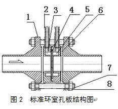 - 法蘭;2、導(dǎo)壓管;3、前環(huán)室;4、節(jié)流件;5、后環(huán)室;6、密封墊片;7、螺栓;8、螺母