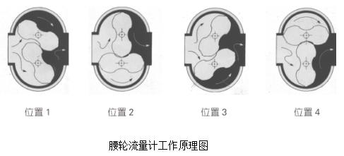 智能氣體腰輪(羅茨)流量計,主要由殼體、共軛轉(zhuǎn)子、計數(shù)器和智能流量轉(zhuǎn)換器等部件構成。裝于計量室內(nèi)的一對共軛轉(zhuǎn)子在流通氣體的出入口壓差(P入>P出)作用下,通過精密加工的調(diào)校齒輪使轉(zhuǎn)子保持正確的相對位置。轉(zhuǎn)子間、轉(zhuǎn)子與殼體、轉(zhuǎn)子與墻板間保持最佳工作間隙,實現(xiàn)了連續(xù)的無接觸密封。轉(zhuǎn)子每轉(zhuǎn)動一周,則輸出四倍計量室有效容積的氣體,轉(zhuǎn)子的轉(zhuǎn)數(shù)通過磁性密封聯(lián)軸裝置及減速機構,傳遞到智能流量轉(zhuǎn)換器,從而顯示輸出氣體的累計體積量。其計量過程和工作原理如圖所示(圖中僅表示了四分之一周期)。