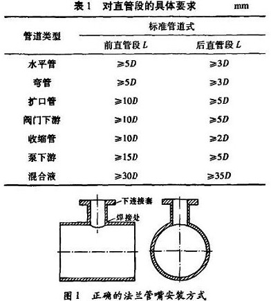 流體在方向、管徑以及閥門開度變化時,會產生渦流和流場畸變,這樣會對傳感器電極的測量產生影響,從而影響儀表的精度。所以要盡可能地離開彎管、手閥、調節閥等部件一定距離,直管段的具體要求見表l。表中,D表示管道通徑,L表示傳感器到閥門或彎頭等部件的距離。