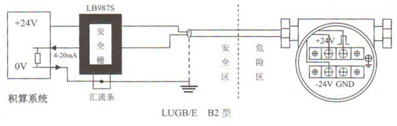 一、輸出頻率信號(hào)的三線制渦街流量?jī)x表配線設(shè)計(jì) 渦街流量計(jì)輸出頻率信號(hào)的三線制流量傳感器采用DC24V或DC12V電源供電,一般通過(guò)三芯屏蔽電纜線(RWP3×0.5mm)與顯示儀表或計(jì)算機(jī)相連,屏蔽層應(yīng)可靠地接到放大器殼的接地螺絲上。屏蔽電纜線的選擇應(yīng)適合現(xiàn)場(chǎng)環(huán)境要求,另外屏蔽電纜線要與其它強(qiáng)功率電力線分離,不能平行走線。 二、輸出標(biāo)準(zhǔn)4~20mA電流信號(hào)的兩線制渦街流量?jī)x表配線設(shè)計(jì) 輸出標(biāo)準(zhǔn)4~20mA電流信號(hào)的兩線制變送器采用DC24V電源供電,一般通過(guò)兩芯屏蔽電纜線(RWP3×0.5mm)與顯示儀表或計(jì)算機(jī)相連,屏蔽層應(yīng)可靠地接到放大器殼的接地螺絲上。屏蔽電纜線的選擇應(yīng)適合現(xiàn)場(chǎng)環(huán)境要求,外屏蔽電纜線要與其它強(qiáng)功率電力線分離,不能平行走線。 三、帶RS-485通訊接口功能的渦街流量?jī)x表配線設(shè)計(jì) 帶RS-485通訊功能的渦街流量?jī)x表采用DC24V電源供電,與其它設(shè)備之間采用四線制傳輸方式。 四、防暴型渦街流量?jī)x表配線設(shè)計(jì) LUGB/E三線制脈沖輸出型渦街流量?jī)x表與LB978齊納安全柵相連、LUGB/E兩線制標(biāo)準(zhǔn)4~20mA電流輸出型渦街流量?jī)x表與LB987S齊納安全柵相連可構(gòu)成本質(zhì)安全型防爆系統(tǒng),產(chǎn)品防爆標(biāo)志為Ex iaⅡCT2-T5。本安防爆型渦街流量傳感器/變送器與防爆安全柵和積算系統(tǒng)等關(guān)聯(lián)設(shè)備的接線性請(qǐng)參看防爆安全柵廠家提供的接線說(shuō)明和以下所示圖。 注意事項(xiàng): (1)防爆型傳感器和變送器安裝于危險(xiǎn)場(chǎng)所,安全柵、顯示儀表、供電電源,計(jì)算機(jī)等關(guān)聯(lián)設(shè)備必須安裝在安全場(chǎng)所。 (2)傳感器和變送器應(yīng)有可靠接地,防爆地線不得與強(qiáng)電系統(tǒng)保護(hù)接地共用。