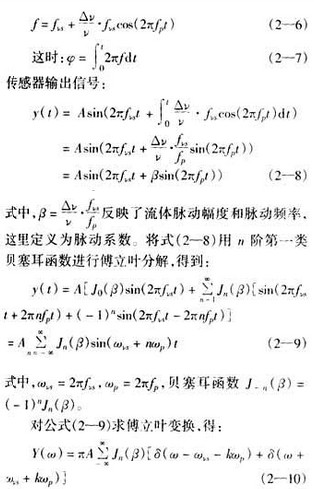 1 引 言 在過程控制和流體計量中,渦街流量計應用相當廣泛。渦街流量計本質上是一種流體振動型流量計,因此易受測量現場的機械振動和不穩定流場等噪聲的干擾,測量精度往往得不到保證。如何從含有噪聲的信號中提取流量信息,是流量測量一直沒能很好解決的難題,F場的噪聲各種各樣,其中,脈動流是一種對測量精度影響較大的噪聲干擾。 筆者根據國外研究成果,從理論上分析了脈動流干擾下渦街傳感器的輸出信號,采用貝塞耳函數分解出渦街流量信號頻率和脈動干擾頻率,分析流體脈動對渦街流量計測量的影響;說明了在脈動流干擾下出現的鎖定現象;提出了提高流量計測量精度的方法。 2脈動流對測量的影響 2.1渦街流量計測量原理 渦街流量計是基于“卡門渦街”原理的流體振動型流量計,壓電傳感器表體內有一個漩渦發生體,當流體流過漩渦發生體時,在其后部兩側交替產生兩列漩渦,一側漩渦分離的頻率與流體的流速成正比。 其中,f為漩渦分離頻率(Hz);ν為管道內流體的平均流速(m/s);St為斯特羅哈常數;d為漩渦發生體迎流面寬度(m);D為管道內徑(m)。 漩渦的分離頻率在一定雷諾數范圍內與通過管道的流體流量成線性關系: 因而,通過測量漩渦分離頻率,就可知道流體的流速,測出通過管道的流體的流量。 2.2脈動流條件下渦街流量計測量結果 在流體穩定流動條件下,壓電傳感器輸出的電壓信號為正弦波。正弦波的頻率與流體的流速成正比,幅度與流體的密度和速度的平方成正比。 流體穩定流動狀態下,管道內流體流動平均速度為ν。在脈動流作用下,管道內流體的流速疊加了隨時間周期變化的脈動分量[1]: 式中,Δν為流體脈動時偏離穩態流速的最大幅度,fp為脈動頻率。 因為漩渦分離頻率與管道內流體流動速度成正比,所以脈動流條件下的漩渦分離的瞬時頻率為: 流體脈動條件下,渦街流量計輸出信號疊加了調頻噪聲。從公式(2—10)可以看出,輸出信號的頻譜包含以渦街信號主頻率fνs為中心的較寬的頻帶,fνs左右兩則對稱分布了無窮多邊頻分量,邊頻分量和主頻分量之間的間隔恰為脈動頻率的整數倍,它們的幅度大小由對應的各階貝塞耳函數所決定。 脈動系數β也是一個重要的參數,它的大小變化對輸出信號的頻譜結構有著重要的作用。由貝塞耳函數曲線(如圖2—1所示)可知,當β≤1時,只有J0(β)和J1(β)有比較大的數值,而J2(β),J3(β)等均可以忽略,因此,輸出信號的頻譜實際上只有ωνs和wνs±nwp組成。當β>1時,隨著β的增大,邊頻分量數目增多。