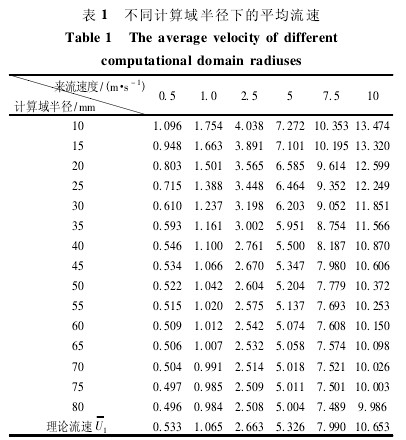 取計(jì)算域半徑在 10 ~ 80 mm 的范圍內(nèi),通過(guò)GAMBIT 軟件分別建立模型,再由 FLUENT 軟件分別進(jìn)行仿真,得出在不同半徑的計(jì)算域內(nèi)所對(duì)應(yīng)的體積加權(quán)平均流速,如表 1 所示。