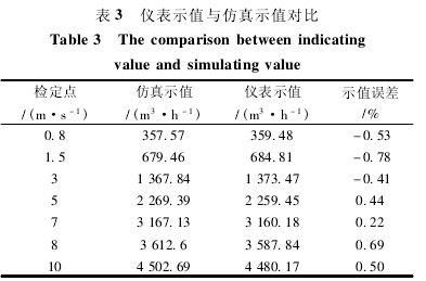 為了驗(yàn)證通過(guò)上述方法所得到的插入式電磁流量計(jì)等效信號(hào)作用范圍的可靠性,把該尺寸的傳感器探頭形狀加工制作成流量計(jì)樣機(jī)在口徑為 400mm 的管道上進(jìn)行流量測(cè)量,插入深度也保持在 120mm。其測(cè)量得到的體積流量與仿真得到的流量進(jìn)行對(duì)比,如表 3 所示,其中計(jì)算仿真流量示值所用的流速是上述得到的等效信號(hào)作用范圍內(nèi)的平均流速ū。