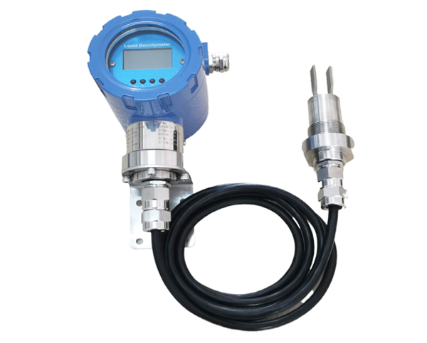 傳感器根據振動原理而設計,此振動元件類似于兩齒的音叉,叉體因位于齒根的一個壓電晶體而產生振動,振動的頻率通過另一個壓電晶體檢測出來,通過移相和放大電路,叉體被穩定在自然諧振頻率上。當液體流經叉體時,振動發生改變,引起諧振頻率變化,從而通過電子處理單元計算出準確的密度值。振動頻率與密度的關系為: ρ=K0+K1T+K2T²